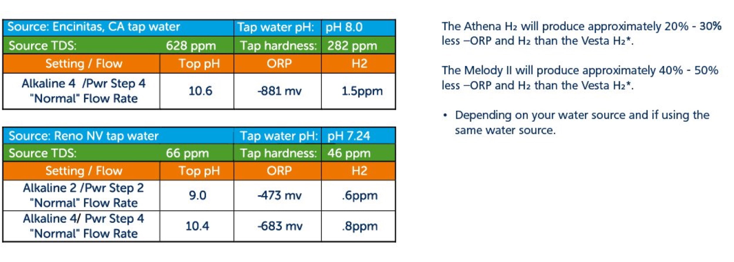 That is a lot of information. However we feel these all are important points for properly informed dealers and customers to consider before simply reading – and believing – a company’s declaration that "our ionizer does X ppm of H2". Bearing all that in mind, below are our internal test results for the Vesta H2. Please be sure to note the different source waters and resulting results. All in all, the Vesta H2 is a stellar performer in hard or soft water. What is better is you can achieve excellent H2 results on lower alkaline settings and lower pH. Most ionizers will not produce any hydrogen water at lower power settings. All other features and benefits aside, we think the Vesta H2 is unique in our industry just for that reason.