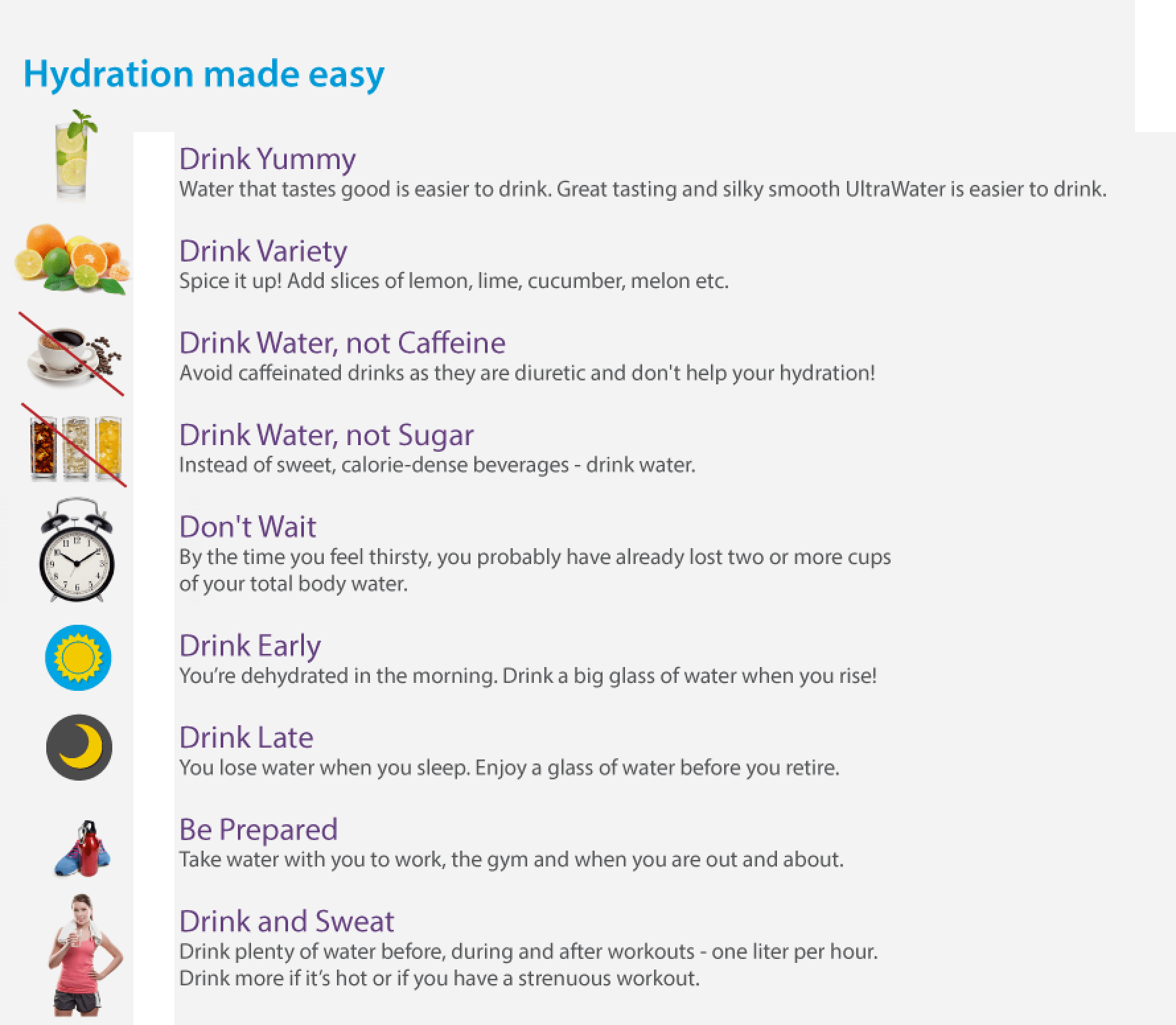 You’ll find them informative and fun. And, then drink up. Every time you drink a glass of great-tasting and healthy UltraWater you will be on the road to good health. Your body will thank you.